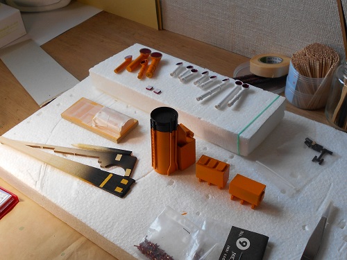 ←68、ブリッジの部品の取り付け。 69、 →70、ホイールハウスと舵輪部の組み立て。